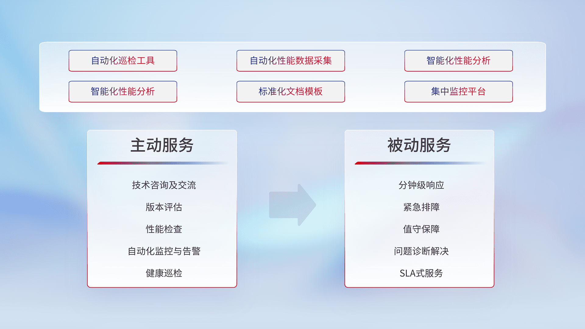 智能化工具和标准化文档,,保障服务质量,,,,提供主动服务(包含技术咨询、、、、版本评估、、性能检查、、、自动化监控与告警、、、、健康巡检)和被动服务包含(分钟级响应、、、紧急排障、、、值守保障、、问题诊断解决、、、SLA服务)。。