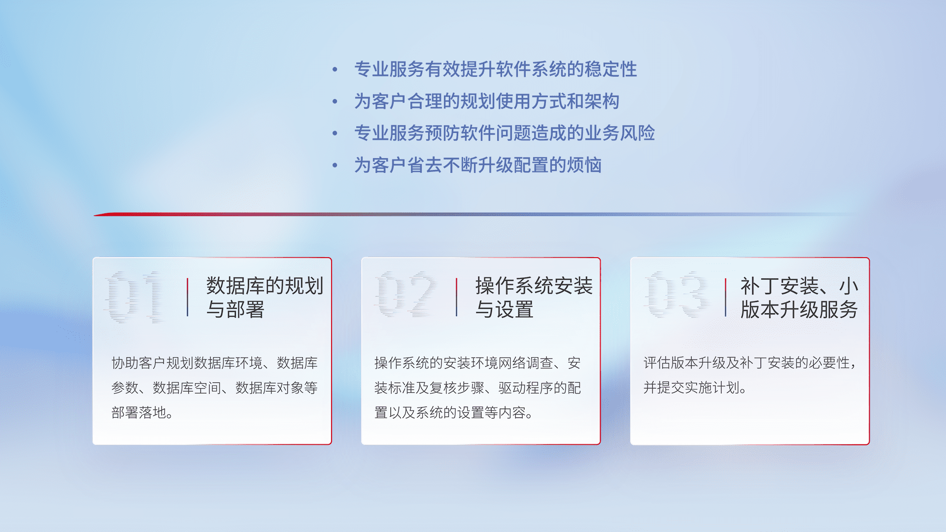为客户提供软件规模升级、、快速部署、、、、按需配置的专业服务,,,从数据库的规划与部署到操作系统的安装与设置,,,再到补丁安装和小版本升级提供支持。。。。